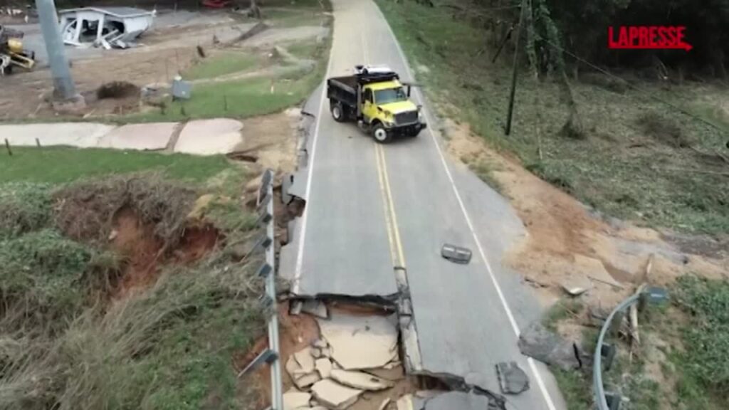 Oltre 400 strade chiuse in North Carolina per il passaggio dell’uragano Helene. In totale sono oltre 160 le vittime di Helene negli Stati Uniti: si tratta del secondo uragano più mortale che ha colpito gli Usa negli ultimi 50 anni dopo Katrina nel 2005 che uccise almeno 1.833 persone. Nelle immagine del drone una strada devastata delle inondazioni provocate dall’uragano.