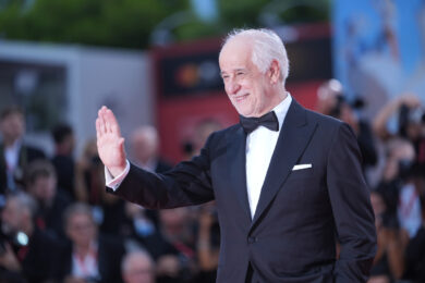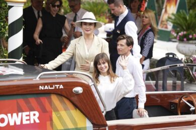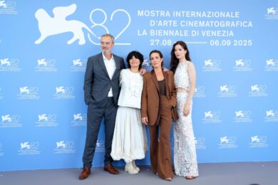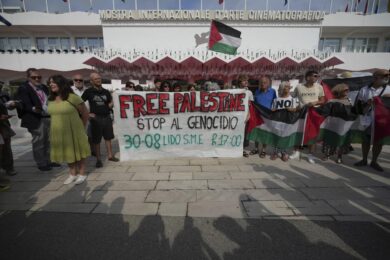 Pro Palestine demonstrators hold a press conference in front of the red carpet to, with a banner that reads ‘Free Palestine, Stop the Genocide’ to announce a demonstration on Saturday, Aug. 30 during the 82nd edition of the Venice Film Festival in Venice, Italy, on Wednesday, Aug. 27, 2025. (Photo by Alessandra Tarantino/Invision/AP)