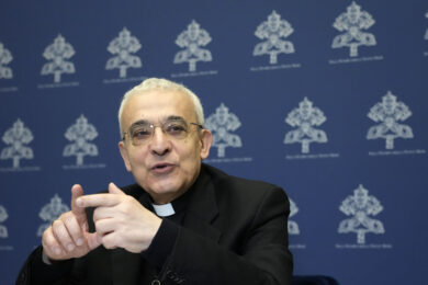 Archbishop Filippo Iannone, Prefect of the Dicastery for Legislative Texts, attends an interview with the Associated Press at the Vatican press room, Saturday, March 25, 2023. Pope Francis on Saturday updated a 2019 church law aimed at holding Catholic hierarchs accountable for covering up cases of sex abuse, expanding the norms to cover lay Catholic leaders and reaffirming that vulnerable adults can also be victims of abuse when they are unable to consent. (AP Photo/Alessandra Tarantino)