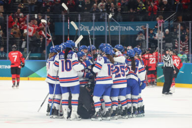 10 febbraio 2026, Milano, Lombardia, Italia: le giocatrici degli Stati Uniti festeggiano dopo aver sconfitto il Canada nella partita del girone A di hockey su ghiaccio femminile durante i Giochi Olimpici Invernali Milano Cortina 2026 alla Milano Santagiulia Ice Hockey Arena (Cal Sport Media via AP Images)