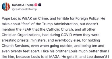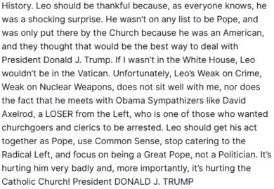 Galleria foto Articolo – foto 1 Il post su Truth in cui Donald Trump ha attaccato papa Leone XIV. (Foto: Truth Social, Donald Trump) Leggi l’articolo