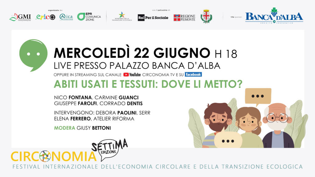 con Nico Fontana, Montecolino; Corrado Dentis, Dentis Recycling Italy; Giuseppe Farolfi, Greenthesis Group; Carmine Guanci, Vestisolidale, e gli interventi di Elena Ferrero, Atelier Riforma e Debora Paolini, Settimana Europea per la Riduzione dei Rifiuti