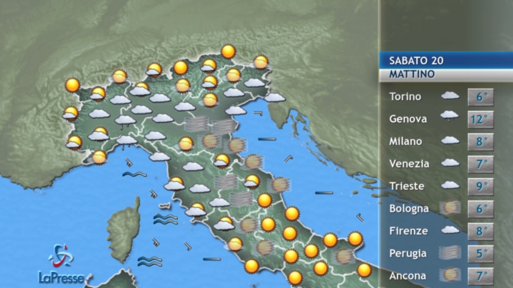 Sabato nuvole al Nord e Toscana, con qualche debole pioggia su Liguria e Basso Piemonte. Prevalenza di tempo soleggiato nel resto d’Italia. Al mattino nebbie a banchi su pianure del Nord, valli del Centro e coste adriatiche. Temperature massime in ulteriore leggero aumento al Nordest, Medio Adriatico e Sud.