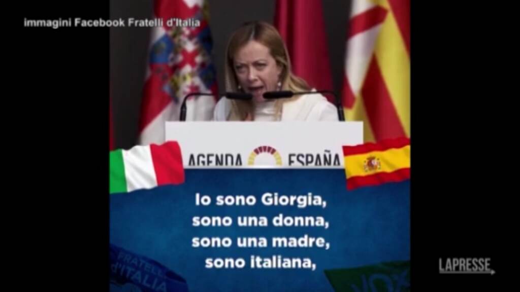 (LaPresse) “Yo soy Giorgia, soy una mujer, soy una madre, soy italiana, soy cristiana”. La leader di Fratelli d’Italia Giorgia Meloni ripete, dal palco dell’assemblea del partito di destra spagnolo Vox a Madrid, lo slogan che aveva pronunciato dal palco di Roma, a San Giovanni, nel 2019. “Sono Giorgia, sono una madre, sono cristiana” aveva detto Meloni: le sue parole erano diventate anche una parodia musicata che aveva raccolto migliaia di visualizzazioni. DISTRIBUTION FREE OF CHARGE – NOT FOR SALE