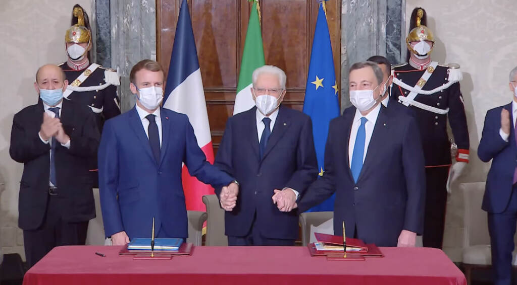 A firmare l’intesa sono stati Emmanuel Macron e il premier Mario Draghi, alla presenza del capo dello Stato. L’intesa è stata seguita dalla stretta di mano tra Draghi e Macron e poi da quella, intensa e prolungata, tra il presidente francese e il Capo dello Stato.