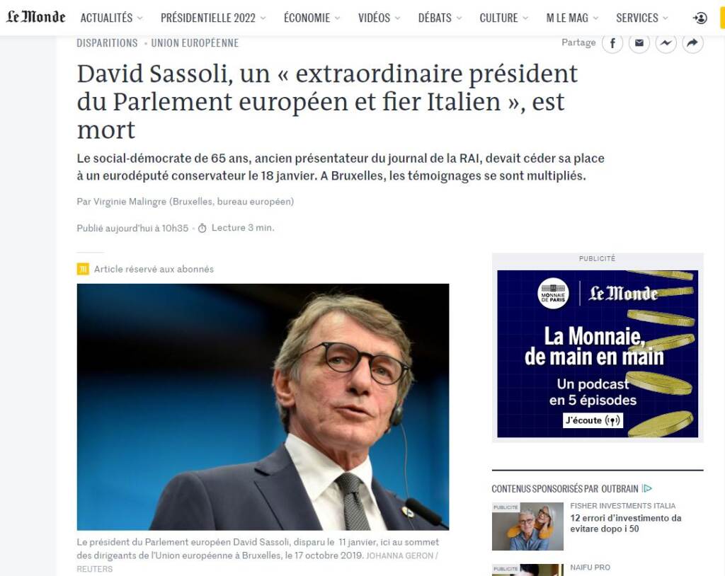 La notizia della morte di David Sassoli ha fatto il giro del mondo. “Uno straordinario presidente del Parlamento europeo e fiero italiano”, titola il quotidiano francese Le Monde. La scomparsa del giornalista e politico italiano è stata annunciata su tutte le principali testate ed emittenti straniere: dalla britannica Bbc all’americana Cnn.