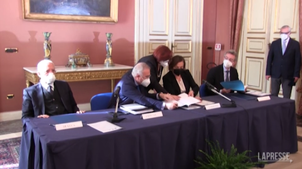 (LaPresse) La ministra dell’Interno Luciana Lamorgese in Prefettura a Napoli ha siglato l’accordo per la promozione e l’attuazione di un sistema di sicurezza partecipata e integrata per lo sviluppo della città. L’intesa è stata firmata anche dal presidente della Regione Campania Vincenzo De Luca, Il sindaco Gaetano Manfredi e il Prefetto Claudio Palomba. ” Solo con lavoro di squadra si vincono le sfide”, ha detto la titolare del Viminale.