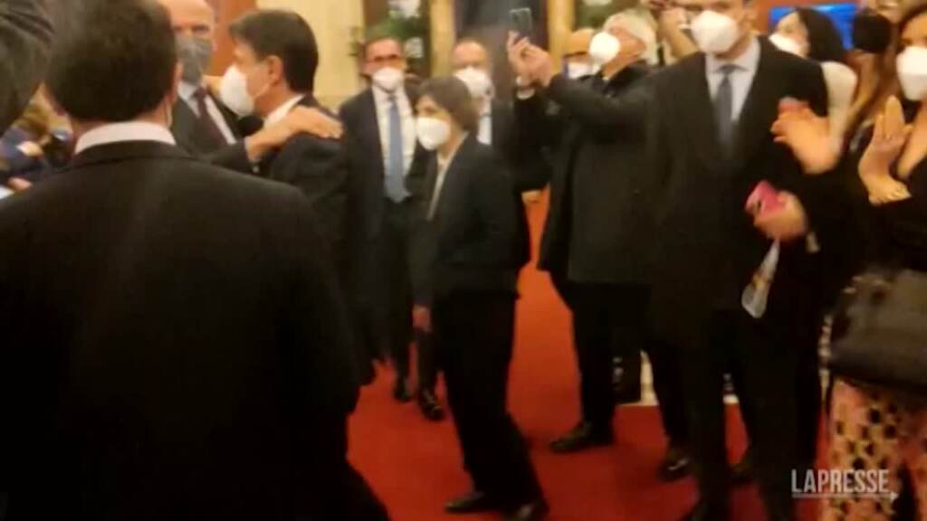 (LaPresse) In Transatlantico alla Camera arriva anche Giuseppe Conte, che abbraccia e dà il cinque al segretario del Pd, Enrico Letta. Applausi per i due leader da parte dei grandi elettori dem e M5S ancora presenti per festeggiare la rielezione del presidente della Repubblica, Sergio Mattarella. Poco dopo si sono uniti per il selfie di rito anche i capigruppo di Leu.