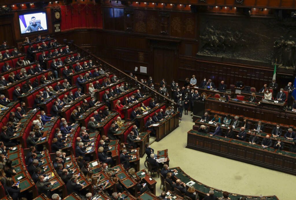 L’aula di Montecitorio accoglie l’intervento in videocollegamento con il presidente ucraino Volodymyr Zelensky, a cui segue il discorso del presidente del Consiglio Mario Draghi. Diverse le polemiche sui probabili assenti: sono diversi i parlamentari, di differente estrazione politica, che potrebbero infatti non presentarsi in Aula, in dissenso più o meno aperto con la decisione di ospitare Zelensky.