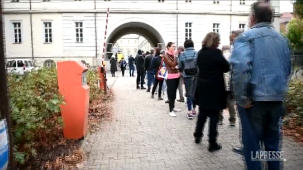 (LaPresse) Lunghe code all’Ufficio elettorale di Corso Valdocco 20 a Torino, dove si ritira la tessera elettorale. La coda ai sviluppa anche fuori dai cancelli della struttura: intorno alle 13 momento c’erano circa 250 persone in coda, Sono circa 40-45 i minuti necessari per arrivare agli sportelli.