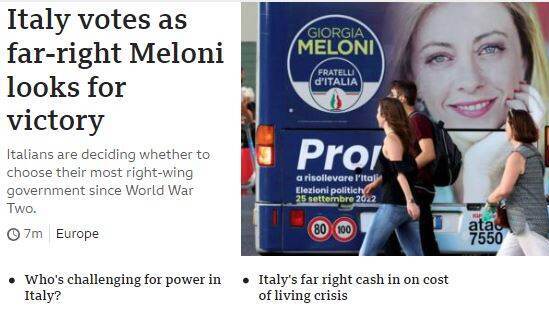 Il sito del canale tv britannico Bbc sul suo portale da’ evidenza alle politiche del Belpaese: “L’Italia vota mentre l’estrema destra della Meloni cerca la vittoria. Gli italiani stanno decidendo se scegliere il loro governo più di destra dalla seconda guerra mondiale, in un’elezione seguita da vicino in tutta Europa. Giorgia Meloni guida il partito di estrema destra Fratelli d’Italia e punta a diventare la prima donna premier del Paese alleata con altri due partiti di destra.