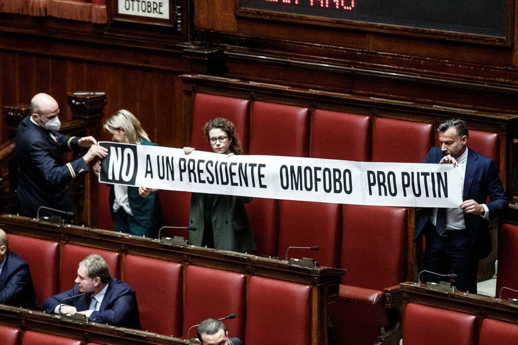 Uno striscione con la scritta ‘No a un presidente omofobo pro Putin’, critico nei confronti del leghista Lorenzo Fontana, in corsa per la presidenza di Montecitorio, è stato esposto alla Camera da alcuni deputati fra cui il dem Alessandro Zan all’inizio della seduta di oggi. Sono intervenuti i commessi richiamati dal presidente dell’Aula, Ettore Rosato.