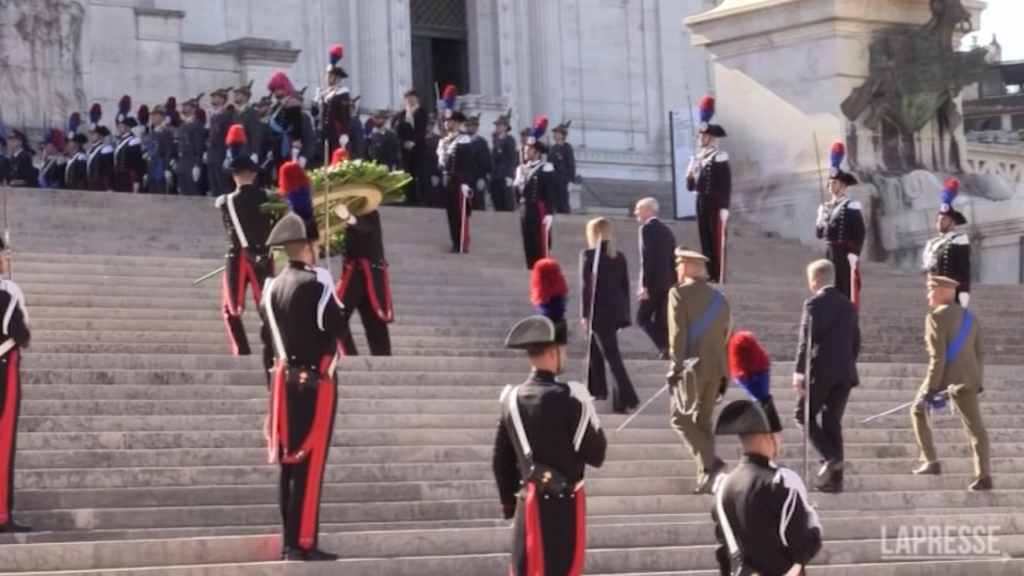 Il presidente del Consiglio Giorgia Meloni depone una corona di alloro e dei fiori sulla tomba del Milite ignoto all’Altare della Patria, a Roma. Le hanno reso gli onori militari i picchetti di Esercito, Marina, Aeronautica, Carabinieri e Guardia di Finanza e la banda dell’Esercito. Sia al suo arrivo che al termine della cerimonia è stata accolta dal coro e dagli applausi dei cittadini presenti si lati di piazza Venezia.