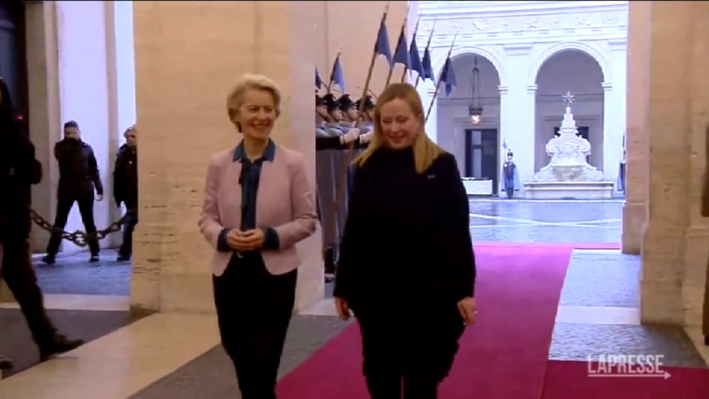 La presidente della Commissione europea, Ursula von der Leyen, è appena arrivata a palazzo Chigi per incontrare la presidente del Consiglio, Giorgia Meloni. La premier ha accolto von der Leyen nel cortile interno di Palazzo Chigi prima della stretta di mano a favore dei fotografi.