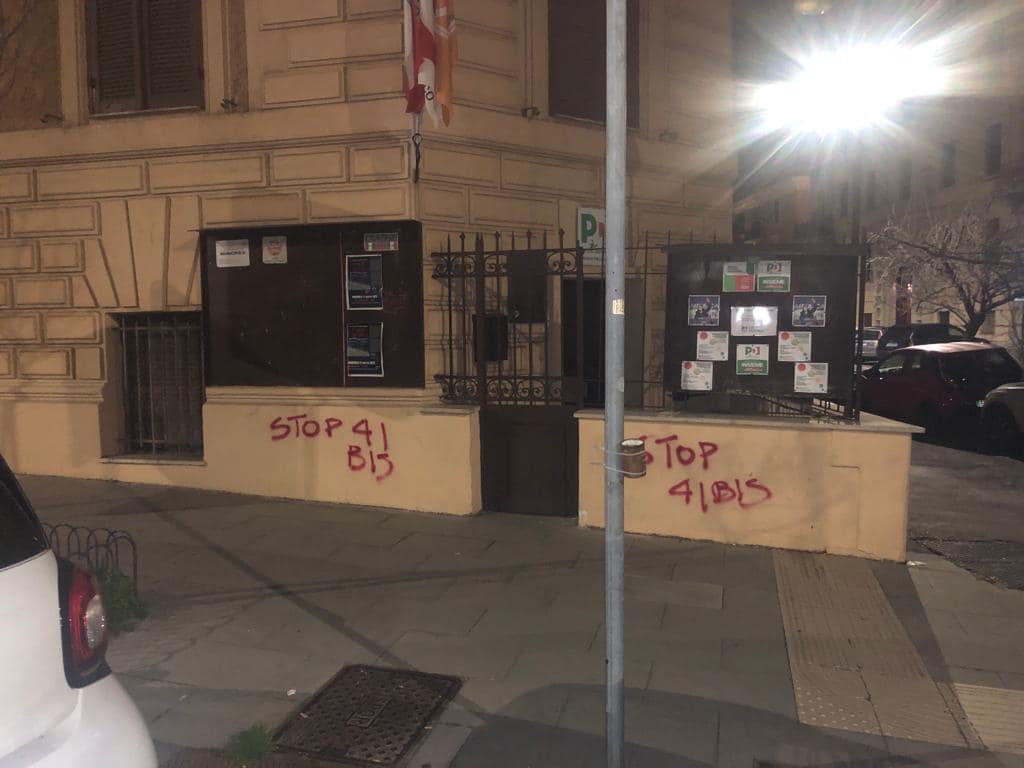 Scritto contro il 41 bis e ‘Alfredo Libero‘ sono comparse questa notte sui muri del circolo Pd ‘Italia-Lanciani’ a Roma. Diverse le scritte, realizzate con vernice rossa, tra cui ‘PD Merd*’ e ‘stop 41bis’, mentre ignoti hanno rotto le finestre del circolo, facendo cadere pezzi di vetro all’interno. La segnalazione al 113 è avvenuta intorno a mezzanotte e mezza. La serranda della finestra del circolo, al piano terra in via Catanzaro, è stata danneggiata dal lancio di un petardo di grosse dimensioni. Intervenuti gli artificieri per la bonifica e la scientifica per i rilievi. Le volanti intervenute sono quelle di Porta Pia e San Lorenzo.