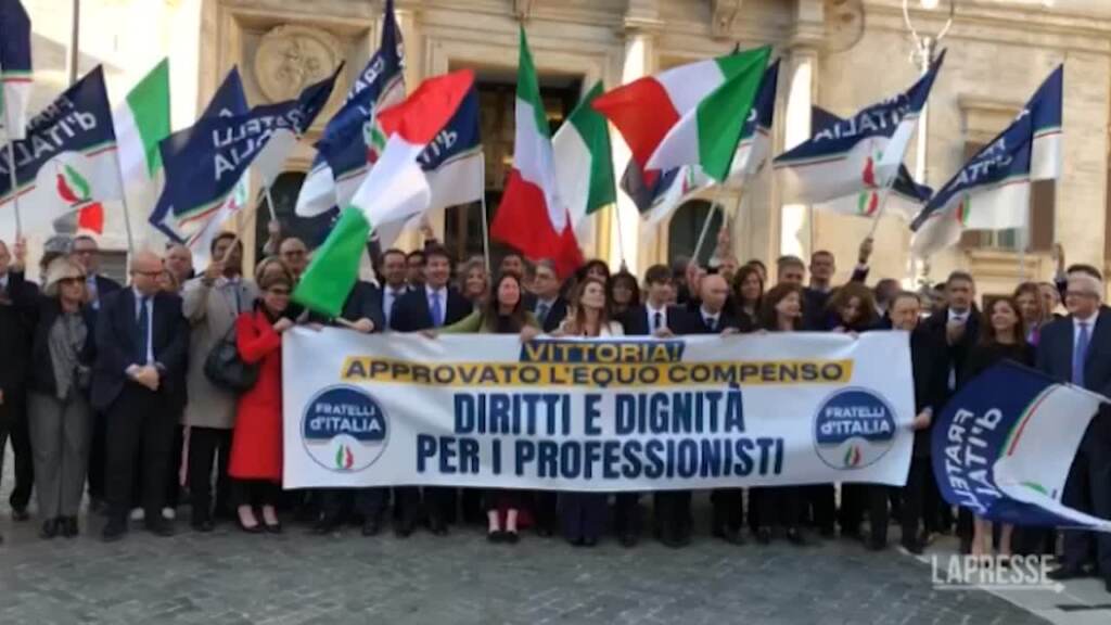 I deputati di Fratelli d’Italia hanno festeggiato con un flash mob davanti a Montecitorio l’approvazione definitiva del progetto di legge sull’Equo compenso delle prestazioni professionali. I parlamentari si sono schierati con bandiere tricolori e del partito dietro un grande striscione con la scritta ‘Vittoria! Diritti e dignità per i professionisti’.