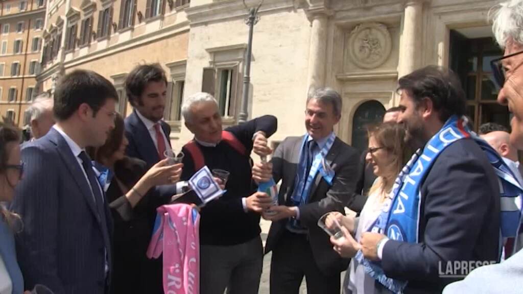 Deputati e senatori campani festeggiano lo scudetto del Napoli e chiedono i biglietti delle partite al presidente De Laurentiis. “Li paghiamo ma non ci fate fare la fila per comprarli, giuro che li paghiamo per intero” dice Gaetano Amato, deputato del M5S che fa appello al presidente del Napoli per avere una “mano” nell’acquisto dei biglietti per le partite”. Nella delegazione dei tifosi anche Gaetano Quagliariello.