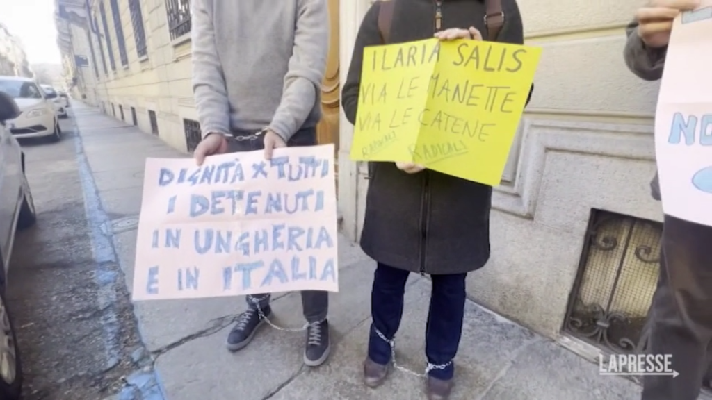 Incatenati come Ilaria Salis davanti consolato ungherese di Torino. E’ il gesto di protesta di Igor Boni e Silvja Manzi, militanti radicali, dopo le immagini che hanno il giro del mondo della 39enne in tribunale a Budapest. “Siamo, come tutti gli italiani, indignati per il trattamento che sta subendo Ilaria Salis. E’ opportuno un impegno forte da parte del governo italiano per far sì che la situazione incresciosa nella quale viene tenuta una nostra concittadina in un Paese dell’Unione europea finisca al più presto”, ha spiegato Manzi aggiungendo: “Anche la situazione dei detenuti in Italia è fuori dal concetto di dignità”.