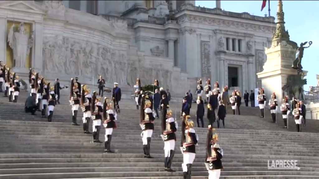 Alte cariche dello Stato presenti all’Altare della Patria, a Roma, per la ‘Giornata dell’Unità Nazionale, della Costituzione, dell’Inno e della Bandiera’. La premier Giorgia Meloni si è intrattenuta ai piedi della scalinata con il presidente del Senato Ignazio La Russa e quello della Camera Lorenzo Fontana in attesa dell’arrivo del Capo dello Stato Sergio Mattarella, accompagnato dal ministro della Difesa Guido Crosetto.