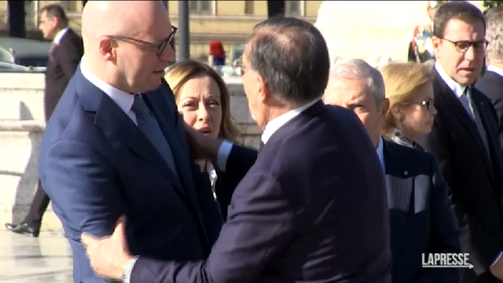 Le autorità all’Altare della Patria per la ‘Giornata dell’Unità nazionale, della Costituzione e della Bandiera’. Oltre al presidente della Repubblica Sergio Mattarella e alla premier Giorgia Meloni, erano presenti il presidente della Camera Lorenzo Fontana e quello del Senato Ignazio La Russa. Questi ultimi due, in attesa dell’arrivo del capo dello Stato, si sono lasciati andare a una sorta di balletto.