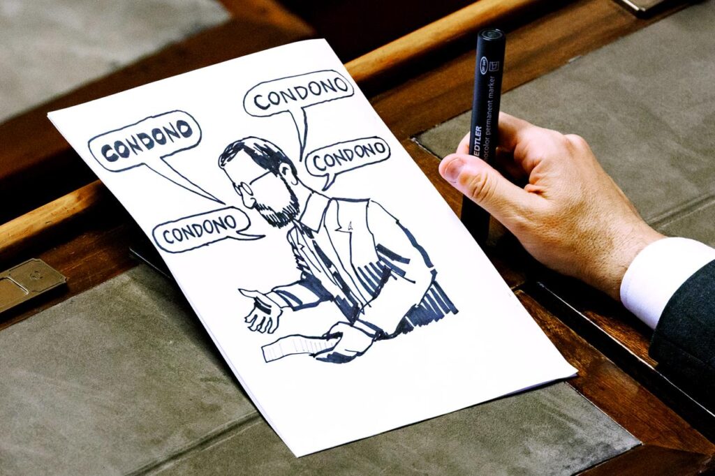 Senatore e vignettista. Stiamo parlando di Filippo Sensi, parlamentare del Partito democratico che ha come nome d’arte Nomfup. Durante il question time a Palazzo Madama è spuntato tra i banchi uno dei suoi disegni che ha come protagonista Matteo Salvini. Il vicepremier oggi in Aula ha parlato del Piano Casa, precisando che “non è un condono” e che “l’obiettivo finale è di abbassare il costo degli affitti”. Il giornalista, blogger e politico romano classe 1968 lo ha quindi preso di mira con un’opera satirica: il ministro viene ritratto mentre dice solo “condono, condono, condono”.