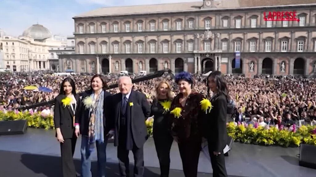 Migliaia di studenti hanno partecipato al flash mob in piazza del Plebiscito, a Napoli, promosso dalla Regione Campania dal titolo “Bella così” in occasione dell’8 Marzo, Festa della donna. Sul palco il presidente Vincenzo De Luca con l’assessore alla Scuola Lucia Fortini insieme ad Anna Tatangelo, Federica Carta, Chadia Rodiguez, Ste e Marisa Laurito.