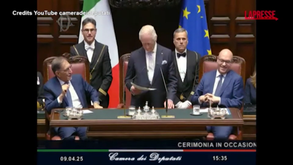 Nel suo discorso alla Camera, Re Carlo ha reso omaggio alla memoria italiana, dalla Resistenza al nazifascismo alla figura dell’eroe antimafia Giovanni Falcone (ricorda che la regina Elisabetta trascorse il suo compleanno a Tivoli e fece visita a Capaci poco dopo l’attentato al magistrato). “L’Italia sarà sempre nel mio cuore, come fu per la mia adorata madre” sottolinea con forza. Ed è standing ovation. Interrotta e ripresa per un errore: si pensava che il sovrano avesse concluso il suo discorso. Lo speaker, che scandisce tutti i momenti, annuncia: “La cerimonia è terminata, i gentili ospiti…”, spiazzando Carlo che tuttavia reagisce sorridendo e dicendo ai presidenti di non aver ancora finito. “It’s a joke, italiani…“, ironizza il presidente Lorenzo Fontana.