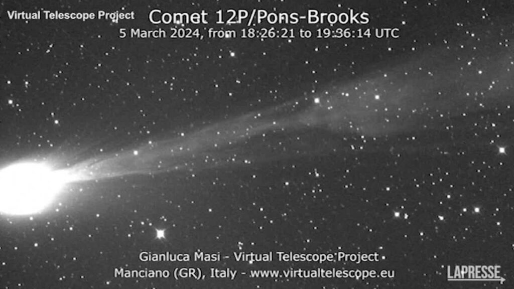 La cometa 12P/Pons-Brooks sta tornando verso la Terra: si tratta di una cometa ‘periodica’ con un periodo orbitale di circa 71 anni. “La Cometa 12P/Pons-Brooks non è visibile a occhio nudo ma lo è con un binocolo o un piccolo telescopio”, spiega Gianluca Masi, astrofisico e direttore del Virtual Telescope Project. Le immagini sono state raccolte proprio tramite la struttura robotica del Virtual Telescope Project in Italia. Sarà vicina alla Terra il 2 giugno 2024.