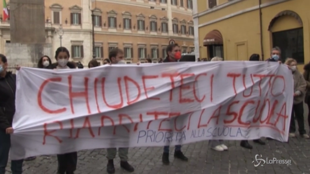 Manifestazione organizzata dal collettivo “Priorità alla scuola” domenica mattina in piazza Montecitorio di fronte alla Camera dei Deputati per protestare contro il lockdown formativo che da lunedì 15 marzo porterà 6,9 milioni di studenti italiani, otto ragazzi su dieci (81%) degli 8,5 milioni di alunni iscritti nelle scuole statali e paritarie, a seguire le lezioni con la didattica a distanza. “Una situazione inaccettabile, dopo tanti proclami di riportare la scuola al centro, ora il Governo chiude nuovamente”, hanno commentato i manifestanti: “I ragazzi sono disperati. Il timore è che si arrivi fino alla fine dell’anno in dad. Una situazione devastante per gli adolescenti”.