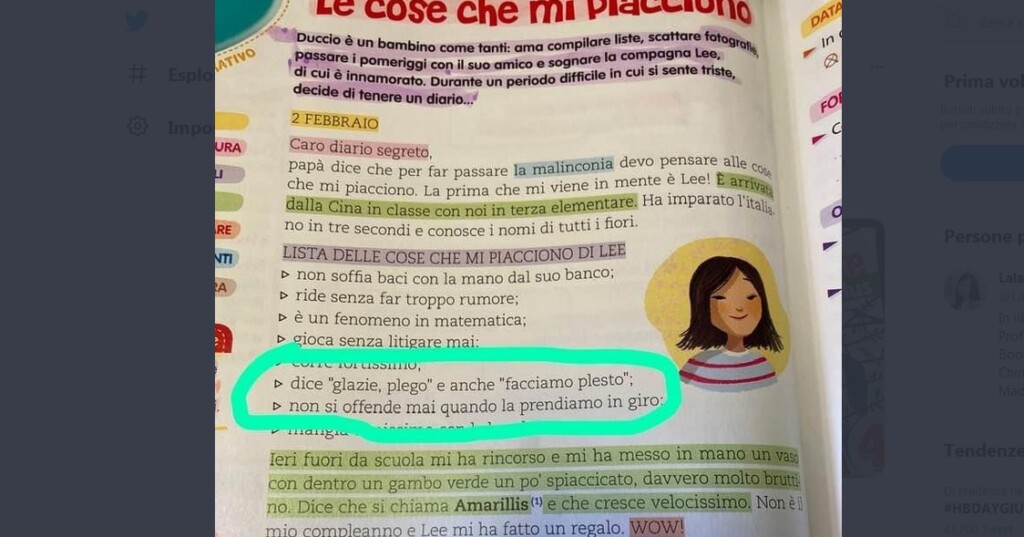 Nel libro di testo la bimba cinese dice ‘glazie, plego‘ e ‘facciamo plesto’. Ma soprattutto “non si offende mai quando la prendiamo in giro”. La surreale scritta è stata postata su Twitter dalla docente e scrittrice Lala Hu, che ha scritto: “Che ne sa Giunti Editore del trauma dei bambini quando vengono bullizzati? A parte gli stereotipi sui bambini di origine cinese come esser bravi in matematica, ‘glazie, plego, facciamo plesto’? E comunque non si chiamerebbe Lee”. Tante le risposte un po’ shockate mentre il Corriere della Sera riporta la reazione di Giunti: “In questo caso faccio fatica a trovare il problema – spiega Stefano Cassanelli, editore – Siamo attentissimi ai testi che possano generare obiezioni su questioni di genere, soprattutto” aggiunge e poi conclude “qui non ci vedo niente che abbia a che fare con il bullismo”.