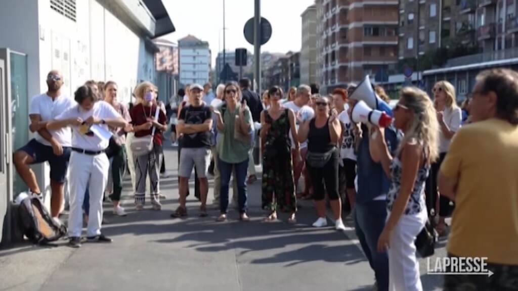 (LaPresse) Manifestazione sotto al Provveditorato degli studi di Milano, in Via Soderini, contro il green pass: una cinquantina di persone tra genitori e insegnanti si è trovata per protestare contro l’obbligo del certificato verde per entrare a scuola proprio nel giorno in cui in molte regioni d’Italia gli studenti tornano tra i banchi. Al presido anche il candidato sindaco a Milano Gianluigi Paragone.