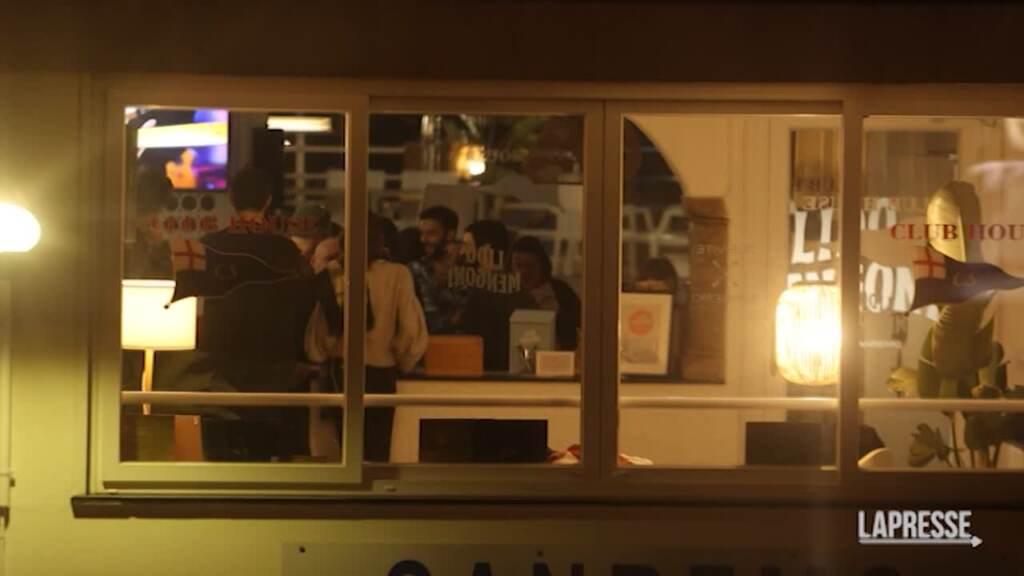 Marco Mengoni brinda con gli amici in un locale di Sanremo dopo la prima serata del Festival. Il cantante è al primo posto nella classifica provvisoria.