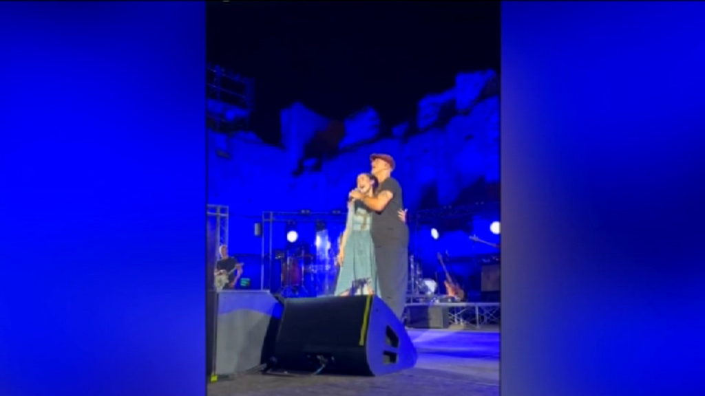 Duetto tra Eros Ramazzotti e la figlia Aurora sul palco del Teatro Antico di Taormina giovedì 3 agosto. I due hanno contato il brano che l’artista romano aveva composto per la nascita della ragazza dal titolo “L’Aurora”.