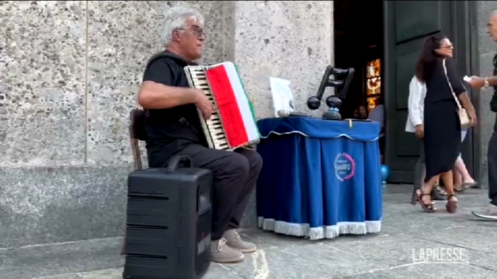 Seduto accanto all’ingresso della chiesa un musicista rende omaggio a Toto Cutugno, poco prima dell’inizio dei funerali del cantautore, suonando “L’italiano” con la sua fisarmonica. L’ultimo saluto all’artista, morto a 80 anni il 22 agosto scorso, si tiene nella Basilica dei Santi Nereo e Achilleo a Milano.