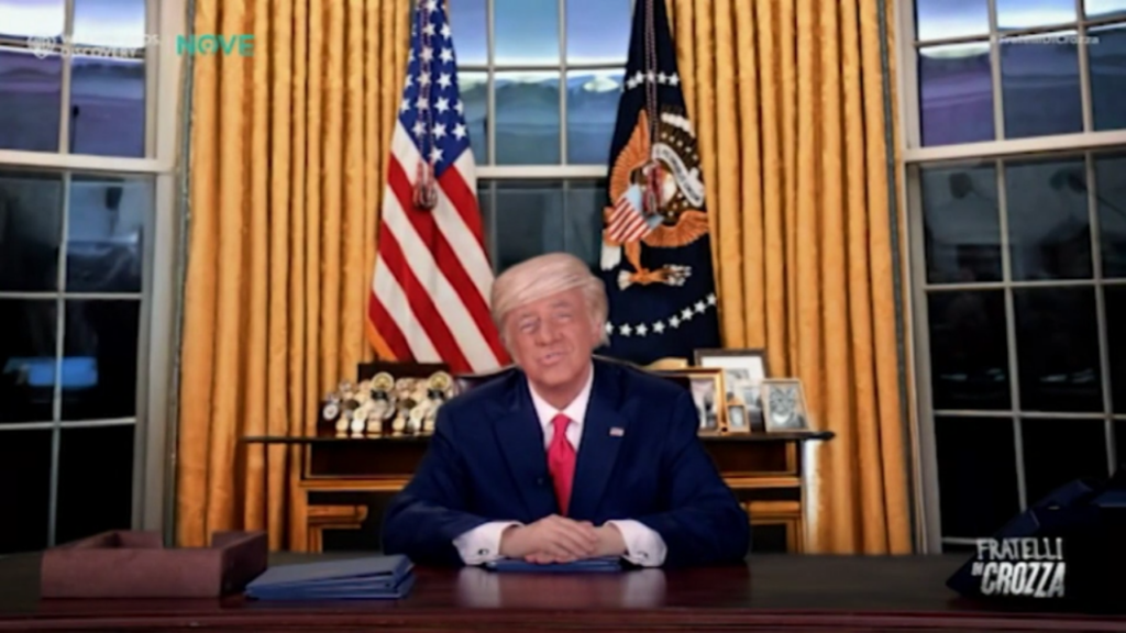 Nella nuova puntata di Fratelli di Crozza, in onda il venerdì sera in prima serata sul Nove e in streaming su Discovery+, Maurizio Crozza / Trump chiama a raccolta ‘i suoi’ Macron, Von Der Leyen e Gentiloni per cambiare la scrivania con la caccola del figlio di Musk. Live streaming ed episodi completi su discovery+ (www.discoveryplus.it)