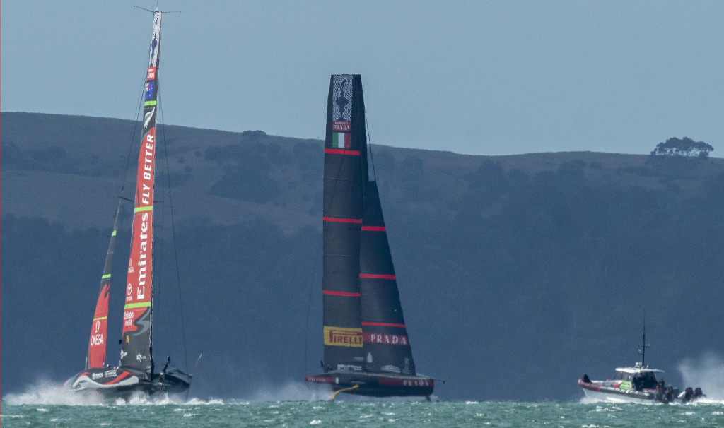 Auckland, New Zealand, 2 March, 2021 – Italian team Luna Rossa Prada Pirelli, co-helmed by Jimmy Spithill and Francesco Bruni, and Emirates Team New Zealand’s Te Rehutia, skippered by Peter Burling, pass each closely followed by their support boats as both teams practice separately on Auckland’s Waitemata Harbour. The two teams will contest the 36th America’s Cup starting March 10. Credit: Rob Taggart/La Presse