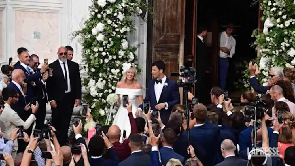 (LaPresse) L’uscita dalla chiesa di San Zaccaria a Venezia di Federica Pellegrini e Matteo Giunta dopo il matrimonio: per i neo-sposi il tradizionale lancio del riso, prima di spostarsi verso la Laguna, circondati dall’affetto della folla.