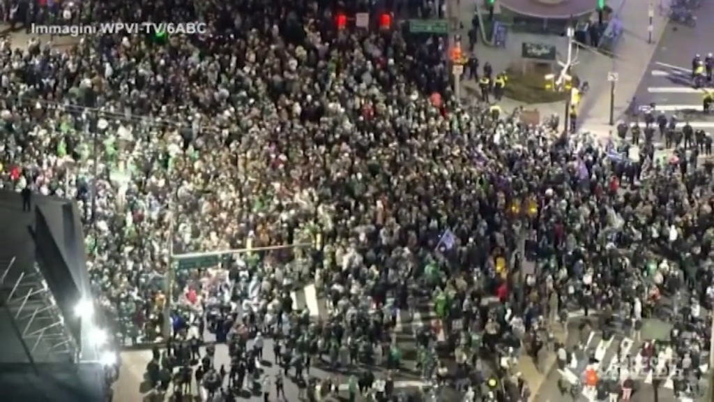 Domenica sera, a Philadelphia, una grande folla si è riversata nelle strade della città per festeggiare dopo che la squadra di football degli Eagles ha sconfitto in NFL i San Francisco 49ers per 31-7. La vittoria manda così le aquile di Philadelphia al Super Bowl del 12 febbraio. Affronteranno i Kansas City Chiefs, che hanno sconfitto i Cincinnati Bengals 23-20.