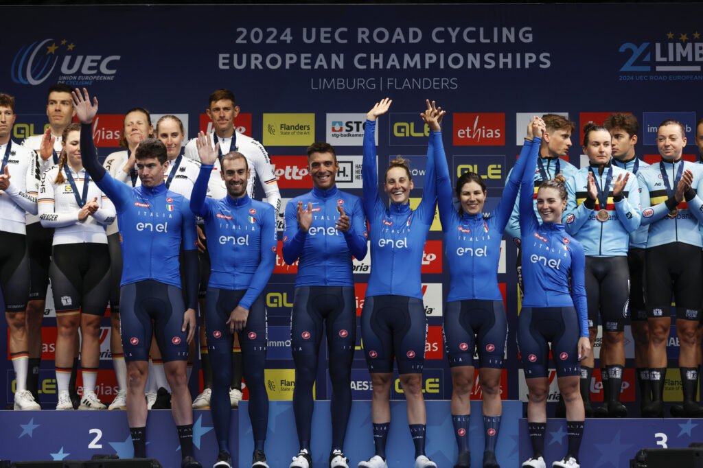 L’Italia ha vinto la medaglia d’oro nella staffetta mista agli Europei di ciclismo su strada in corso a Limburgo, in Olanda. Edoardo Affini, Mattia Cattaneo, Mirco Maestri, Vittoria Guazzini, Elena Cecchini e Gaia Masetti hanno trionfato concludendo i 52 km della prova in 1h1m43s, precedendo di 17 il sestetto della Germania e di un minuto e 32 secondi la squadra belga.