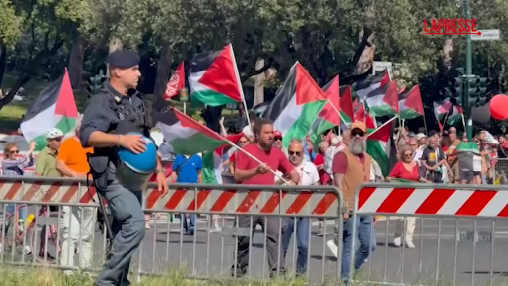 Azione pro Pal durante l’ultima tappa del Giro d’Italia 2025. Centinaia di manifestanti si sono riuniti in piazzale Numa Pompilio, a Roma, dove da ieri sera è in corso un presidio che si è staccato durante la manifestazione contro il Dl Sicurezza. Dopo aver passato qui la notte accampati, nel pomeriggio di oggi i manifestanti si sono avvicinati lungo le transenne che delimitano il percorso, dove hanno sventolato numerose bandiere palestinesi e inneggiato slogan contro lo sterminio in atto a Gaza e le complicità con il governo israeliano di Benjamin Netanyahu. Per l’occasione, una bandiera palestinese è stata alzata in volo legata a dei palloni con gli stessi colori e sono stati lanciati dei fuochi d’artificio. Presenti, tra le varie sigle, Potere al Popolo, Cambiare Rotta, Movimento per il Diritto All’abitare.