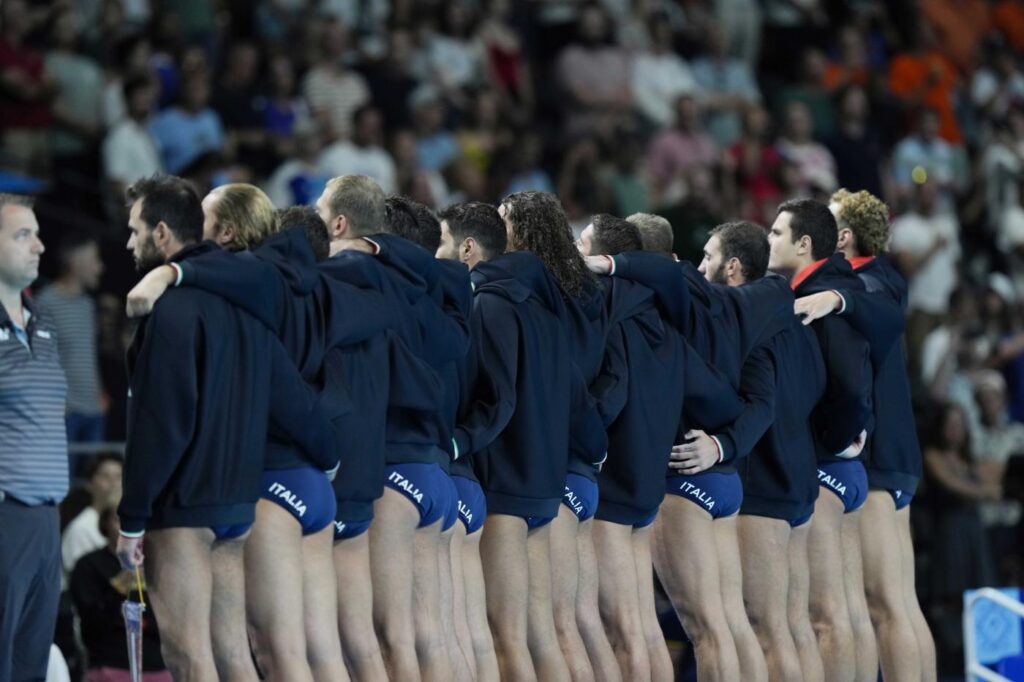 Clamorosa protesta del Settebello prima della finale del 5°-6° posto del torneo di pallanuoto maschile alle Olimpiadi di Parigi. Gli azzurri, che si sono visti respingere il ricorso al Tas contro le decisioni arbitrali di Italia-Ungheria, durante l’esecuzione dell’inno nazionale hanno voltato le spalle agli arbitri in segno di protesta dopo quanto accaduto.