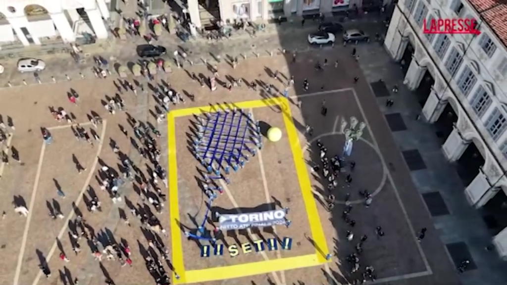 Accanto alla racchetta, composta dai volontari della Città di Torino e delle scuole di tennis locali, hanno completato la scena una pallina da tennis gigante e sette cartelli animati dai partecipanti per formare le scritte “Ace”, “Game” e “Set”. Un tributo al mondo del tennis che varcherà i confini di piazza San Carlo, grazie al web e ai social, inviando un messaggio da Torino a tutto il mondo.