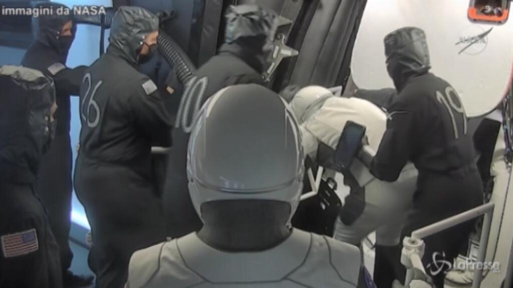 (LaPresse) A pochi minuti dal lancio del razzo di Space X da Cape Canaveral, in Florida, i quattro astronauti entrano nella Crew Dragon 2, aiutati da altri membri dell’equipaggio dell’Agenzia spaziale statunitense. Pronti per il volo spaziale, attendono il countdown.