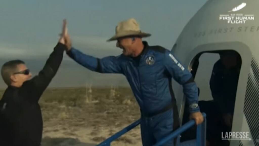Jeff Bezos è stato il primo a uscire dalla capsula della sua Blue Origin quando, dopo il ritorno sulla Terra, si è aperto il portellone. A seguirlo lo studente 18enne Oliver Daemen, poi la 82enne Wally Funk e infine il fratello di Jeff Bezos, Mark. All’apertura del portellone, l’ex ceo di Amazon Bezos ha battuto il cinque a una delle persone che attendeva i quattro, che sono stati accolti da abbracci. È stata poi stappata una bottiglia per festeggiare.