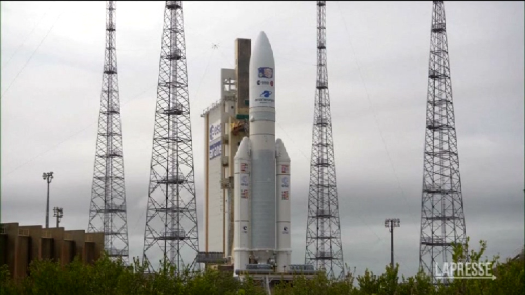 La sonda ‘Juice’ dell’Agenzia spaziale europea è partita alla volta di Giove e delle sue tre lune ghiacciate: Callisto, Europa e Ganimede. ‘Juice’ è partita dalla Guyana Francese, con una missione dell’Esa. Dovrebbe raggiungere Giove nel 2031 e passare tre anni attorno alle tre lune del pianeta. Si ritiene che le tre lune ospitino oceani sotterranei, dove potrebbero trovarsi tracce di vita marina. CREDIT ARIANESPACE/ESA