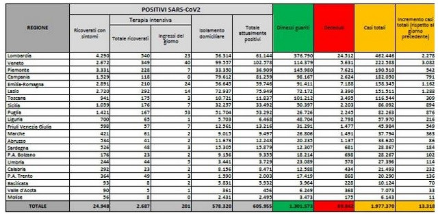 Sono 13.318 i nuovi casi di Covid-19 in Italia nelle ultime 24 ore su 166.205 tamponi. I contagi sono in calo rispetto a lunedì, quando però a fronte di 10.872 nuovi postivi erano stati processati soltanto 88mila test. In netta flessione infatti il rapporto tamponi-positivi, sceso all’8%, rispetto al 12, 37% del giorno prima. Aumentano invece i decessi (628). Lunedì erano 415. Calano di 44 unità le terapie intensive, 197 in meno i ricoveri nei reparti Covid.
