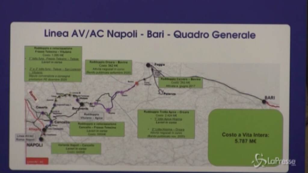 (LaPresse) Presentato a Napoli nella sala De Sanctis di Palazzo Santa Lucia il progetto della tratta Napoli Bari della ferrovia ad Alta Velocità. “La Regione Campania ha avuto un rapporto di collaborazione straordinario con le Ferrovie dello Stato per sbloccare molti dei cantieri sulla linea Napoli-Bari. Avremo 10 lotti che partono, miliardi di euro di lavori. Queste opere possono determinare un’occupazione fra 5 e 6 mila unità lavorative”. Così il governatore campano, Vincenzo De Luca. “Abbiamo di fronte la crisi del Paese e la voglia di Webuild è non solo di realizzare il Pnrr ma anche la fiducia nel futuro”, cosè invece Pietro Salini, ad di Webuild.