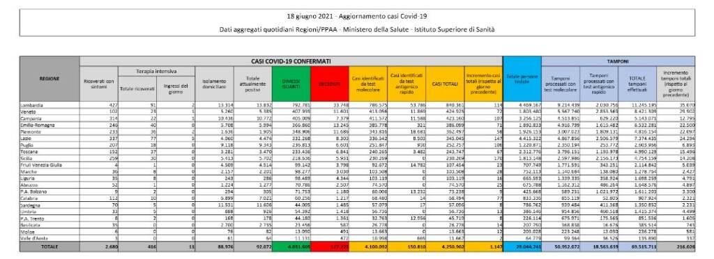 Sono 1.147 i nuovi contagi da Covid-19 in Italia a fronte di 216.026 tamponi. Il tasso di positività si attesta così allo 0,5%. Lo evidenzia l’ultimo bollettino del ministero della Salute. I decessi sono 35 per un totale aggiornato a quota 127.225 da inizio pandemia. Continua la discesa dei numeri negli ospedali: le terapie intensive sono 416, -28 nelle ultime 24 ore mentre i ricoveri ordinari sono in totale 2.680, 208 in meno rispetto a ieri.