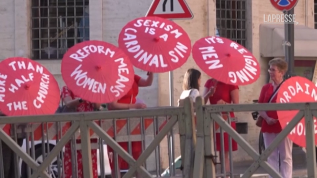 Protesta di alcune manifestanti questa mattina in Vaticano, a Roma, durante la riunione di Papa Francesco con i cardinali per una due giorni di discussioni sulle riforme della costituzione della Chiesa cattolica. Le manifestanti, vestite di rosso e con cartelli con la scritta “Il sessismo è un peccato cardinale”, “Ordinare le donne”, “Regnano gli uomini” e “Più di metà della Chiesa”, sostengono il sarcedozio femminile.
