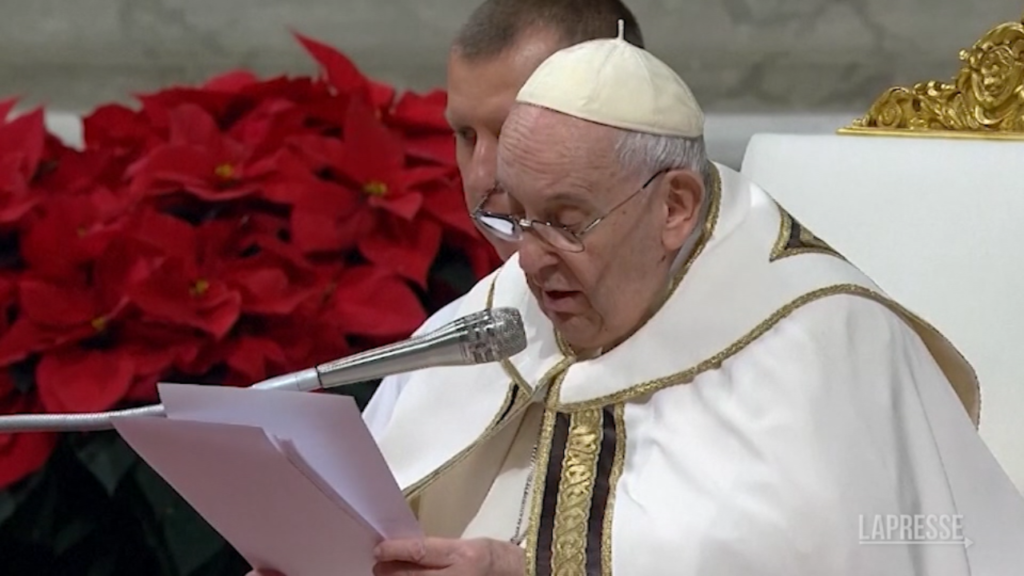 Papa Francesco ha rivolto il suo pensiero ai bambini, specialmente a quelli divorati dalle guerre. “Anche in questo Natale un’umanità insaziabile di soldi, potere e piacere non fa posto, come fu per Gesù, ai più piccoli, a tanti nascituri, poveri, dimenticati”, ha sottolineato il Pontefice nell’omelia della messa natalizia davanti a circa 7mila fedeli presenti nella Basilica di San Pietro. Arrivato in sedia a rotelle alla celebrazione, Bergoglio ha invitato a ritrovare il senso del Natale esortando a guardare la mangiatoia, un elemento essenziale del presepe.